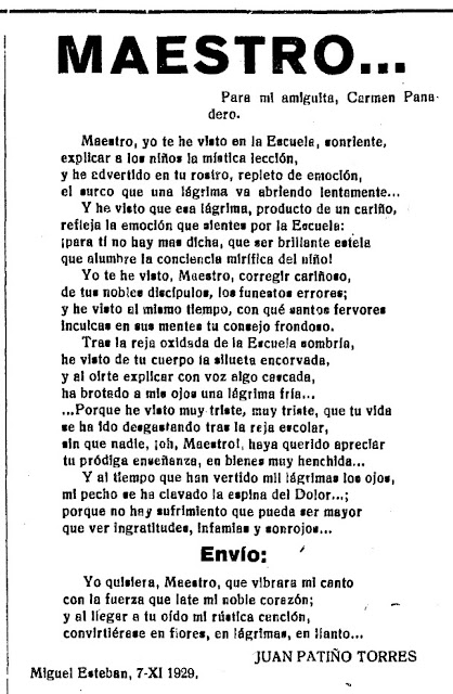En este artículo se volverán a publicar dos de los textos de Juan Patiño Torres, que han sido rescatados del olvido. En uno nos habla de pedagogía y en el segundo un poema dedicado a la docencia.